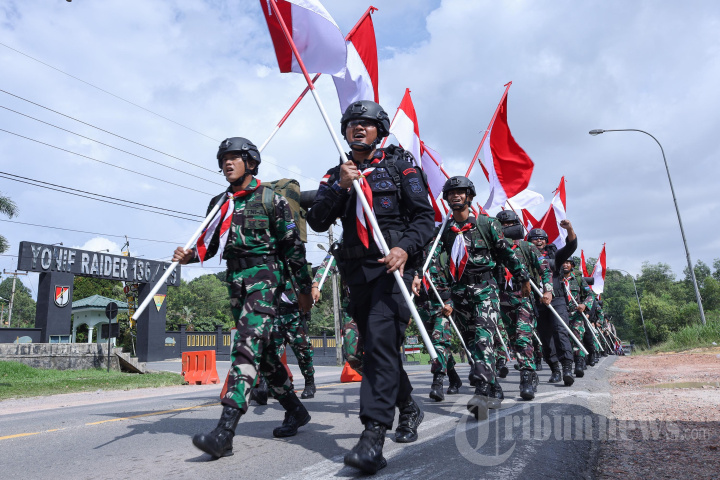 Anggota TNI dan Polri membawa bendera merah putih saat mengikuti kirab kebangsaan menuju jembatan fisabilillah Kota Batam, Provinsi Kepulauan Riau, Rabu (16/8). Kirab kebangsaan yang diikuti personil dari TNI dan Polisi ini dalam rangka perayaan HUT ke-78 Kemerdekaan Republik Indonesia. (TRIBUN BATAM/ARGIANTO DA NUGROHO)
