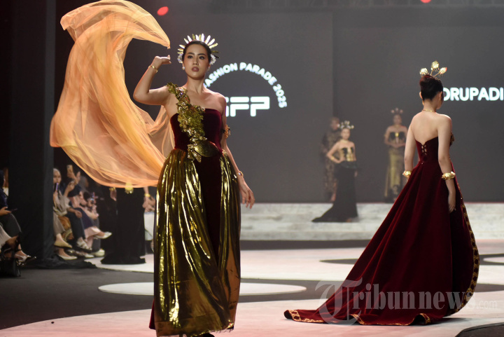 GODDESS OF CHAOS - Model memperagakan busana karya desainer Lisa Drupadi & Bianca Drupadi bertajuk ???Goddess of Chaos??? di perhelatan Surabaya Fashion Parade 2025 tahun ini mengambil tema Rebellion di Convention Hall Tunjungan Plaza (TP) 3, Surabaya, Jumat (14/11/2025) malam. Sebanyak 11 desain interpretasi modern dari mitologi Yunani tentang dewi Athena, simbol perebutan, kebijaksanaan, dan kekuatan perempuan yang memadukan etnik dan kemegahan modern, diwujudkan melalui proses handmade yang dikerjakan secara teliti dari bordir hingga detail payet pada setiap busana dengan warna yang mendominasi emas,hitam dan merah sehingga mampu memancarkan aura royal, berani, dan elegan. SURYA/AHMAD ZAIMUL HAQ