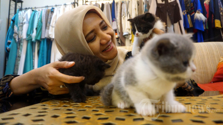 Desainer busana muslim, Lia Afif bersama kucing koleksinya di kediamanya di kawasan Galaxy Bumi Permai, Kota Surabaya, Jawa Timur, Rabu (20/7/2022). Sebanyak 18 ekor kucing di antaranya jenis Bengal, BSH (British Short Hair), BSH Munchkin, dan Scottish Fold & Sphynx jadi hobi baru untuk hiburan dan refreshing di sela-sela kesibukan mendesain baju. SURYA/AHMAD ZAIMUL HAQ