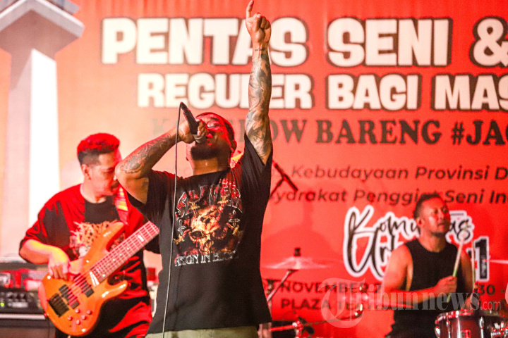 KONGKOW BARENG KOMUNITAS - Grup musik beraliran death metal, Hell Army membawakan lagu saat panggung Kongkow Bareng #JagaJakarta di pelataran Taman Ismail Marzuki (TIM), Jakarta, Minggu (9/11/2025). Pagelaran musik dan seni dari berbagai komunitas hasil kolaborasi Dinas Kebudayaan DKI Jakarta, Unit Pengelola Pusat Kesenian Jakarta Taman Ismail Marzuki (UP PKJ TIM) dan Masyarakat Penggiat Seni Indonesia (MPSI) ini dalam rangkaian perayaan HUT ke-57 Taman Ismail Marzuki (TIM) yang jatuh pada 10 November. TRIBUNNEWS/IRWAN RISMAWAN