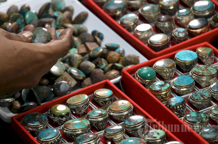 KONTES BATU - Pengunjung memilih aneka batu dan perhiasan pada Kontes dan Pameran Batu Mulia se-Indonesia di Kaza Mall Surabaya. Minggu (23/11/2025). Gelaran oleh Pemerintah Kota (Pemkot) Surabaya bersama Komunitas Pirus Indonesia ?diikuti peserta dari berbagai daerah seluruh Indonesia yang diisi dengan bazar dan pameran batu serta kontes yang terbagi menjadi beberapa kategori untuk memperebutkan 'Piala Walikota Surabaya" . (SURYA/HABIBUR ROHMAN)