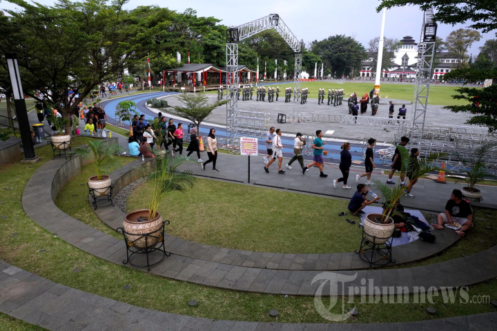 Warga yang sedang berolahraga sore melintasi aktivitas pemasangan tenda untuk upacara dan gladi pengibaran bendera di Lapangan Gasibu, Kota Bandung, Jawa Barat, Senin (12/8/2024). Dalam rangka persiapan dan pelaksanaan upacara Hari Ulang Tahun (HUT) ke-79 Kemerdekaan RI dan HUT ke-79 Jawa Barat, Lapangan Gasibu akan ditutup sementara dari 14 hingga 19 Agustus 2024. Kembali akan dibuka untuk umum pada 20 Agustus 2024. (TRIBUN JABAR/GANI KURNIAWAN)