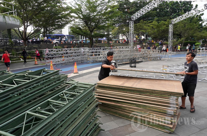 Warga yang sedang berolahraga sore melintasi aktivitas pemasangan tenda untuk upacara di Lapangan Gasibu, Kota Bandung, Jawa Barat, Senin (12/8/2024). Dalam rangka persiapan dan pelaksanaan upacara Hari Ulang Tahun (HUT) ke-79 Kemerdekaan RI dan HUT ke-79 Jawa Barat, Lapangan Gasibu akan ditutup sementara dari 14 hingga 19 Agustus 2024. Kembali akan dibuka untuk umum pada 20 Agustus 2024. (TRIBUN JABAR/GANI KURNIAWAN)