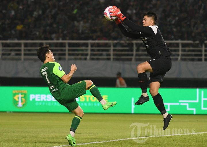BEREBUT BOLA - Pemain Persebaya Rivera (kiri) berhadapan dengan kiper Persis Gianluca) pada pertandingan yang berlangsung di Stadion Gelora Bung Tomo (GBT) Surabaya, Rabu (18/9/2024) malam. Pada Laga Liga 1 Musim 2024/ 2025 Matchday ke-1 ini Persebaya berhasil memenangkan pertandingan dengan skor akhir 2-1. (SURYA/HABIBUR ROHMAN)