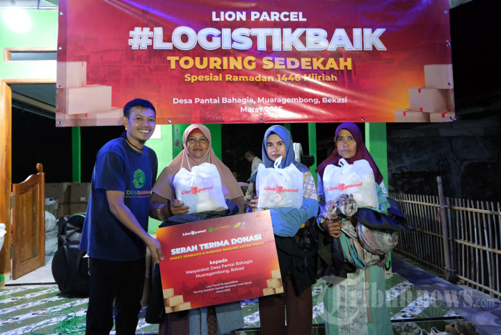 PENYERAHAN DONASI - Chief Marketing Officer Lion Parcel Kenny Kwanto (kiri) bersama General Manager Donasi Barang Hambali (kanan) melakukan serah terima donasi secara simbolis kepada Staf Desa Pantai Bahagia Sonhaji (tengah). Di momen Ramadan, Lion Parcel bekerja sama dengan lembaga Donasi Barang berbagi ratusan paket sembako dan barang-barang layak pakai kepada masyarakat Desa Pantai Bahagia, Muaragembong, Bekasi, Jumat (21/3/2025). Lion Parcel (PT Lion Express), perusahaan logistik terkemuka di Indonesia, bekerja sama dengan lembaga Donasi Barang menggelar kegiatan Corporate Social Responsibility (CSR) #LogistikBaik Touring Sedekah Ramadan dengan berbagi ratusan paket sembako dan barang-barang layak pakai kepada masyarakat Desa Pantai Bahagia, Muaragembong, Bekasi. Sejalan dengan misi #LogistikBaik, kegiatan CSR ini merupakan komitmen Lion Parcel untuk turut memberikan manfaat bagi masyarakat sekitar khususnya di bulan Ramadan. TRIBUNNEWS/HO