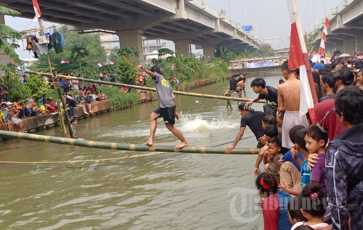 Peserta mengikuti lomba jalan di atas bambu dan pukul bantal di Kalimalang, Cipinang Melayu, Jakarta Timur, Sabtu (27/8/2022). Lomba di Kalimalang telah menjadi tradisi warga sejak tahun 1981 itu digelar untuk memeriahkan HUT ke-77 Republik Indonesia. Namun sejak dua tahun terakhir lomba tersebut terpaksa dihentikan karena pandemi Covid-19. Warta Kota/Henry Lopulalan