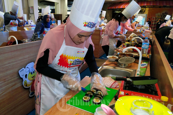 Para peserta membuat menu makanan sesuai kategori yang diikutinya dalam acara Lomba Masak Indomaret 2023 Season 3 di Braga City Walk, Jalan Braga, Kota Bandung, Jawa Barat, Sabtu (4/3/2023). Lomba dengan total hadiah Rp 260 juta itu diselenggarakan dua hari, 4 - 5 Maret 2023. Pada hari pertama menggelar dua kategori, yakni masakan baked dessert dan masakan musubi, onigiri dan kimbab yang diikuti 72 peserta. Sementara itu, lomba masak Season 3 ini mengahadirkan tiga juri yakni chef kenamaan Indonesia, seperti Chef Vindex, Chef Degan, dan Chef Kim. (TRIBUN JABAR/GANI KURNIAWAN)
