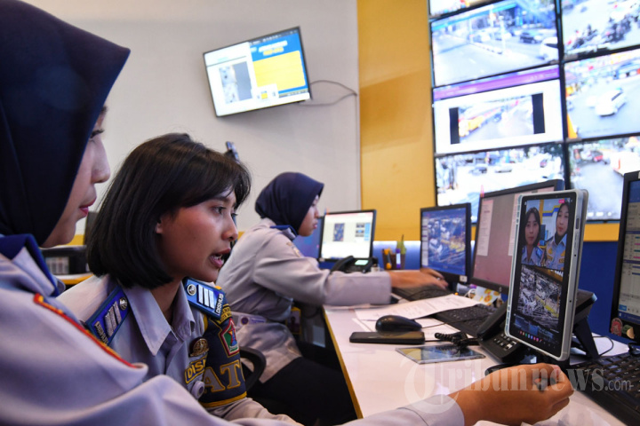 Petugas Dinas Perhubungan (Dishub) Kota Malang saat berada di ruang Area Traffic Control System (ATCS) di Kantor Dishub Kota Malang, Jawa Timur, Senin (29/7/2024). Petugas melakukan himbauan kepada para pengendara dengan voice announcer. SURYA/PURWANTO