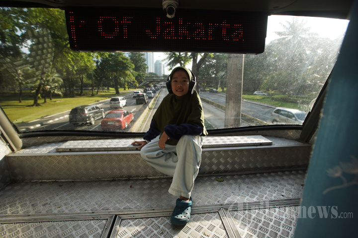 WISATA BUS BERTINGKAT - Pengunjung melihat suasana kota dari atas bus wisata Open Top Tour of Jakarta di Jalan Jenderal Sudirman, Jakarta, Jumat (4/4/2025). Wisata bus dengan rute yang melewati landmark Kota Jakarta menjadi salah satu destinasi warga untuk mengisi waktu libur Lebaran 2025. TRIBUNNEWS/HERUDIN