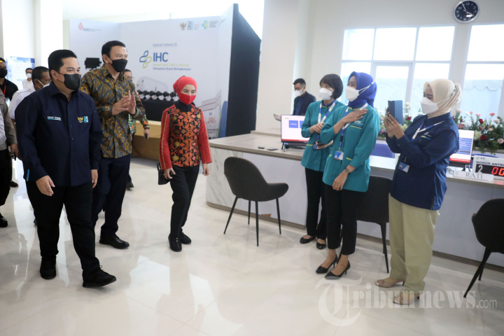 Menteri Badan Usaha Milik Negara (BUMN), Erick Thohir (kiri) didampingi Komisaris Utama PT Pertamina (Persero), Basuki Tjahaja Purnama (kedua kiri) meninjau fasilitas Rumah Sakit Khusus Otak dan Jantung (RSKOJ) Pertamina Royal Biringkanaya usai meresmikannya, di Jalan Pajjaiang, Kota Makassar, Sulawesi Selatan, Rabu (30/3/2022). Rumah sakit otak dan jantung yang memiliki luas bangunan 11.300 meter persegi ini menyediakan alat medis yang canggih dan memiliki kapasitas 80 kamar inap dengan 105 bed, 3 kamar ICU, kamar khusus perawatan intermediet (intermediate care), serta 3 kamar bedah sehingga total 130 bed. Erick Thohir berharap pelayanan Rumah Sakit Otak dan Jantung Pertamina di Makassar yang memiliki 60 dokter spesialis tersebut dapat dirasakan manfaatnya bagi masyarakat yang berada di Indonesia bagian timur. TRIBUN TIMUR/SANOVRA JR