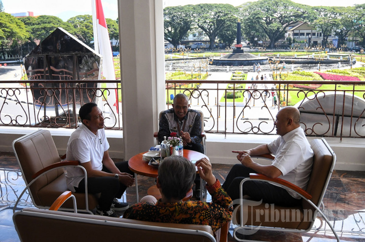 Menteri Koperasi dan Usaha Kecil dan Menengah Republik Indonesia, Teten Masduki (tengah) didampingi Pj Wali Kota Malang, Wahyu Hidayat (kiri), Sekda Kota Malang Erik Setyo Santoso (kanan) melihat suasana Tugu Balai Kota Malang saat kunjungan kerja ke Malang di Balai Kota Malang, Jawa Timur, Jumat (26/4/2024). Menteri Koperasi dan Usaha Kecil dan Menengah Republik Indonesia, Teten Masduki melakukan kunjungan kerja ke Malang serta menikmati suasana heritage di Balai Kota Malang. SURYA/PURWANTO
