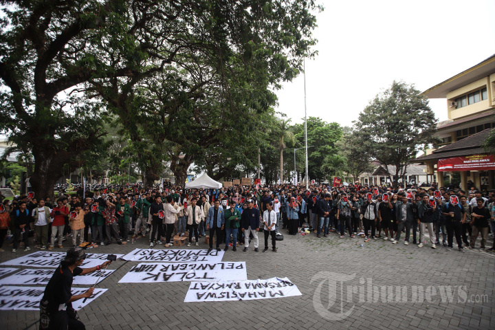 Ribuan mahasiswa dari Aliansi Jaga Demokrasi menggelar Mimbar Demokrasi Mahasiswa Bersama Rakyat Tolak Politik Dinasti dan Pelanggaran HAM di halaman Kampus Institut Senin Indonesia (ISI) Yogyakarta, Kamis (23/11/2023). TRIBUNNEWS/HO
