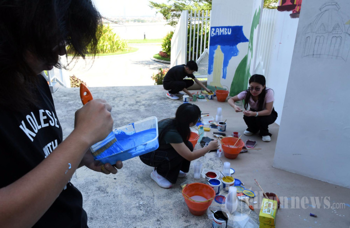 MURAL DI KAMPUS - Dengan dipandu mural artist Surabaya C4KM4D, peserta membuat mural dengan tema 'Surabaya Heritage' di area kampus Petra Christian University (PCU) Surabaya, Rabu (19/6/2024). Kegiatan yang diselenggarakan program studi desain interior PCU ini juga menggelar workshop maket & fotografi serta membuat buket bunga. Pameran yang menampilkan desain board, personal dan presentasi visual ini juga sebagai bentuk eksistensi dari mahasiswa PCU generasi setelah masa pandemi dengan menampilkan beberapa karya lain berupa instalasi serta furniture. (SURYA/HABIBUR ROHMAN)