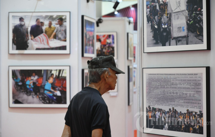 PAMERAN FOTO PILKADA - Pengunjung dan undangan menikmati karya "Pameran Foto & Karikatur Pilkada Serentak 2024 Di Jawa Timur" di Atrium B lantai G Royal Plaza Surabaya, Kamis (13/2/2025). Kegiatan yang berlangsung hingga 16 Februari 2025 ini menampilkan 85 karya foto dan 15 karikatur karya insan jurnalis foto Jawa Timur dengan mengangkat berbagai momen penting seputar Pilkada 2024. SURYA/HABIBUR ROHMAN