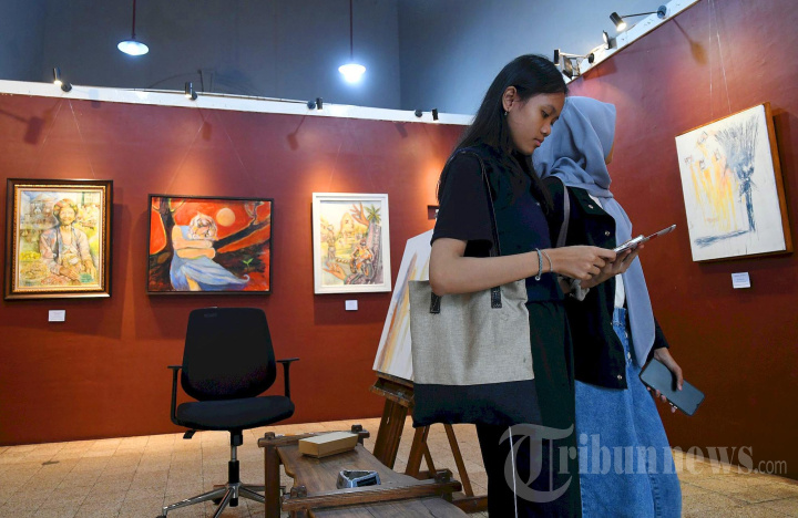 SEMANGAT TUANGKAN KARYA - - Pengunjung memerhatikan deretan lukisan karya dari Djoko Harijanto di 'Galeri Merah Putih' komplek Balai Pemuda Surabaya, Minggu (16/11/2025). Pameran tunggal lukisan cat air ini mengangkat tema "Nglaras Rasa" yang memiliki makna menyelaraskan rasa, upaya menemukan harmoni antara pikiran, perasaan dan pengalaman hidup dinamika manusia dan kehidupan sosial yang dituangkan dalam karya seni oleh pelukis yang tengah berjuang keras menghadapi kondisi gagal ginjal dan diabetes (glukoma) dan mengharuskannya untuk cuci darah tiap minggu. (SURYA/HABIBUR ROHMAN)
