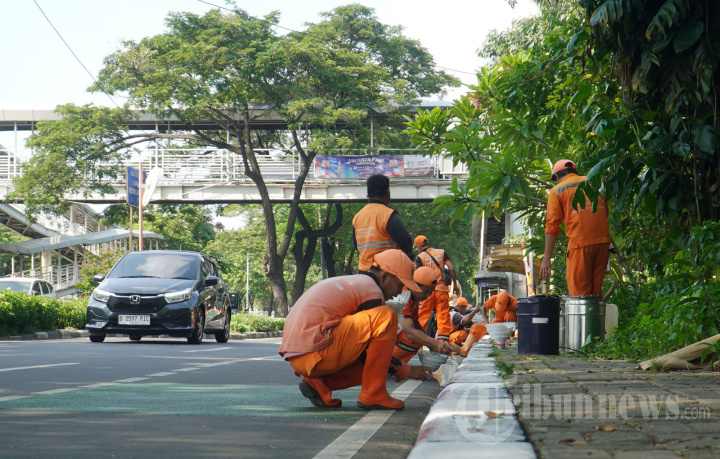 PERCANTIK TROTOAR - Sejumlah pasukan Oranye atau Penanganan Prasarana dan Sarana Umum (PPSU) sedang melakukan pengecatan kembali pembatas trotoar (kanstin) di Jalan Letjen Soeprapto, Cempaka putih, Jakarta Pusat, Jumat (20/6/2025). Dalam rangka menyambut HUT ke-498 DKI Jakarta pasukan PPSU dari Cempaka Putih Timur melakukan pengecatan trotoar karena kondisi pembatas jalan tersebut sudah mulai kusam sehingga perlu pembaharuan agar terlihat indah saat menyambut HUT ke-498 DKI Jakarta pada 22 Juni. Warta Kota/Yulianto