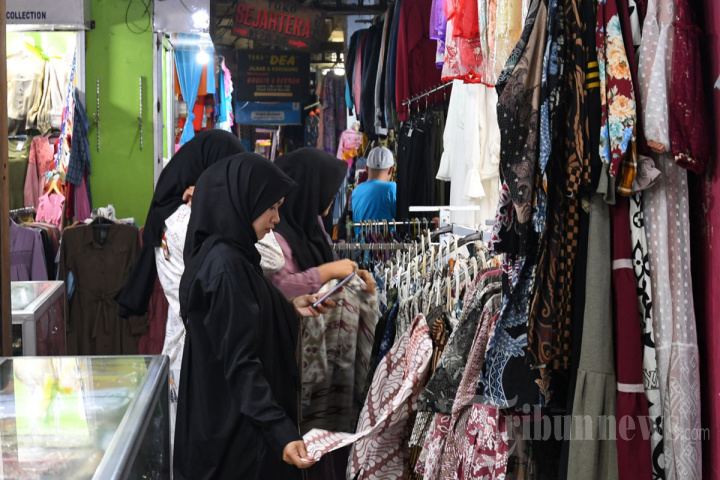 Pembeli melihat dagangan pakaian di Pasar Besar, Kota Malang, Jawa Timur, Rabu (13/9/2023). Pedagang baju atau pakaian mengeluhkan sepinya pembeli akibat terkena gempuran penjualan live online shop. Sepinya penjualan di Pasar Besar Malang mulai terlihat sejak awal pandemi covid-19, banyak warga yang beralih berbelanja daring dan saat ini ditunjang dengan fasilitas live. Akibat banyaknya warga yang membeli di live online shop pedagang mengalami penurunan omset penjualan hingga lebih dari 60 persen. SURYA/PURWANTO