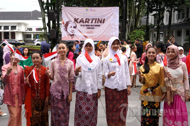 BAJU ADAT - Sejumlah pelajar putri mengenakan kebaya sambil mengibarkan bendera merah putih pada Peringatan Hari Kartini dalam acara apel pagi yang dihadiri Wali Kota Bandung, Muhammad Farhan, di Plaza Balai Kota Bandung, Jalan Wastukencana, Kota Bandung, Jawa Barat, Senin (21/4/2025). Dalam acara tersebut, Wali Kota Bandung, Muhammad Farhan, mengajak masyarakat untuk kembali mengenal Kartini bukan hanya sebagai simbol perempuan, tapi juga sebagai pemikir hebat yang ide-idenya menembus batas zaman. (TRIBUN JABAR/GANI KURNIAWAN)