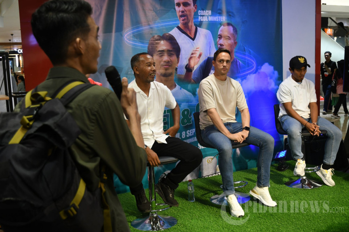 JUMPA FANS - Pelatih Paul C Munster, Asisten Uston Nawawi dan M Taufik menjawab pertanyaan pengunjung pada jumpa penggemar di Matahari Tunjungan Plaza Surabaya, Minggu (8/9/2024). Pada kegiatan 'Meet and Greet' ini pelatih Persebaya yang menjadi brand ambassador sepatu 'Enkai' ini juga memberi kesempatan pada pengunjung dan undangan untuk foto dan tanda tangan. (SURYA/HABIBUR ROHMAN)