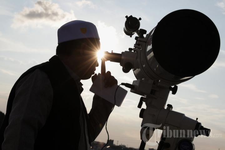 PANTAU HILAL - Petugas mengamati matahari terbenam menggunakan teleskop saat melakukan pemantauan hilal di Masjid Al-Musari'in, Kembangan Utara, Jakarta, Minggu (28/2/2025). Pemantauan hilal tersebut dilakukan untuk menentukan 1 Ramadan 1446 H. TRIBUNNEWS/IRWAN RISMAWAN