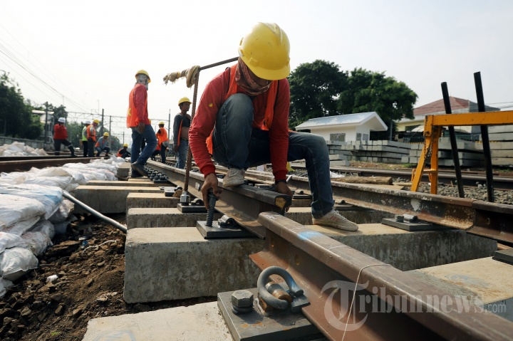 Pekerja saat melakukan pemasangan wesel di perlintasan kereta api kawasan Jatinegara, Jakarta Timur, Senin (25/11/2019). Pemasangan wesel tersebut guna melancarkan perpindahan kereta api dari jalur yang satu ke jalur yang lain dengan menggeser bagian rel yang runcing. (TRIBUNNEWS/Jeprima)