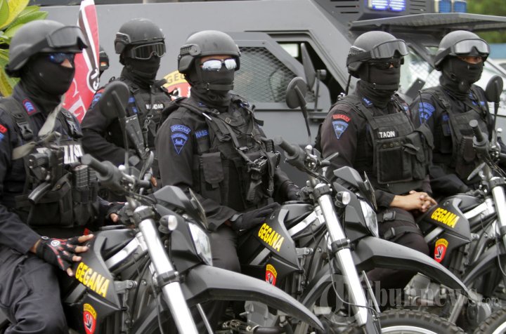 Personel Brimob Polda Aceh mengamankan jalannya kampanye akbar Partai Aceh pada hari terakhir di halaman parkir Stadion H Dimurthala, Lampineung, Banda Aceh, Sabtu (5/4/2014). SERAMBI/BUDI FATRIA