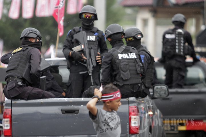Personel Brimob Polda Aceh mengamankan jalannya kampanye akbar Partai Aceh pada hari terakhir di halaman parkir Stadion H Dimurthala, Lampineung, Banda Aceh, Sabtu (5/4/2014). SERAMBI/BUDI FATRIA