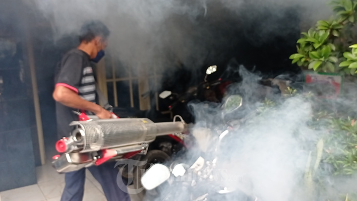 PENGASAPAN - Petugas Kelurahan Batusari, Batuceper, Kota Tangerang, melakukan pengasapan sarang nyamuk Aedes Aegypti di lingkungan warga Rt 01/03, Senin (25/7/2022). Pengasapan dilakukan setelah 26 orang warga setempat terserang enyakit chikungunya. WARTA KOTA/NUR ICHSAN