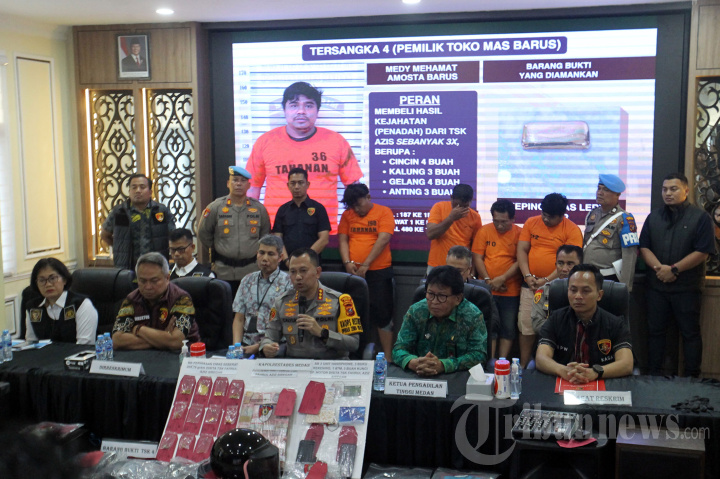 PELAKU PEMBAKARAN RUMAH - Kapolrestabes Medan Kombes Pol Jean Calvin Simanjuntak (tengah) bersama Ketua Pengadilan Tinggi Medan Siswandriyono (dua kanan) dan jajaran memberikan keterangan kepada wartawan terkait pengungkapan kasus pembakaran rumah hakim Pengadilan Negeri (PN) Medan saat gelar konferensi pers di Mapolrestabes Medan, Jumat (21/11/2025). Polrestabes Medan berhasil mengamankan barang bukti dan menangkap empat orang tersangka pelaku pembakaran rumah hakim PN Medan Khamozaro Waruwu, dengan motif sakit hati kepada korban. TRIBUN MEDAN/DANIL SIREGAR