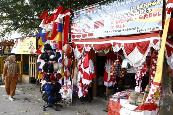 Pedagang menjaga barang dagangannya berupa aksesoris atau pernak-pernik HUT Kemerdekaan RI seperti bendera Merah Putih, umbul-umbul, dan lainnya menjelang peringatan HUT ke-77 RI, di kawasan Kampung Bandan, Jakarta Utara, Minggu (14/8/2022). Harga aksesoris itu sangat variatif mulai dari harga Rp 25 ribu sampai dengan seharga Rp 200 ribu per potongnya, tergantung bagaimana bentuk dan corak motif aksesoris tersebut. Untuk penjualan, menurut pedagang, sementara masih kurang begitu laris, pasalnya masih banyak warga yang belum mengetahui adanya pedagang aksesoris HUT RI yang mangkal di pinggir jalan itu. WARTA KOTA/YULIANTO