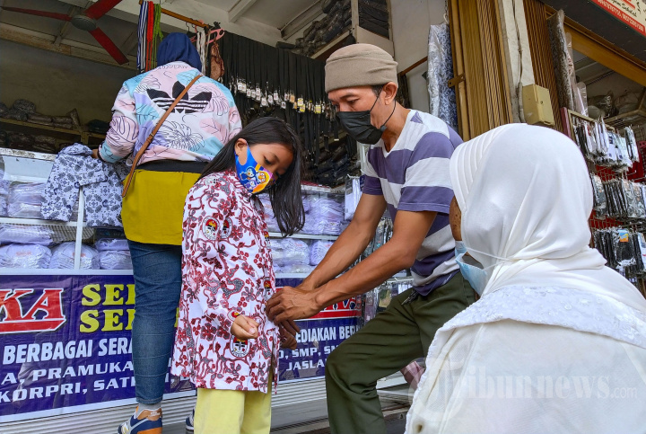 Orang tua membeli seragam sekolah untuk anaknya di salah satu toko seragam sekolah di Jalan Cipaera, Kota Bandung, Jawa Barat, Jumat (7/1/2022). Penjualan seragam sekolah di Kota Bandung masih sepi jelang pembelajaran tatap muka (PTM) 100 persen, pada Senin, 10 Januari 2022. Para pedagang menduga masih melandainya penjualan seragam sekolah diperkirakan karena sebagian orang tua masih menunggu terkait kepastian jadi tidaknya digelar PTM. Karena pengalaman sebelumnya pelaksanaan PTM di Kota Bandung pernah dihentikan saat kasus Covid-19 meningkat. TRIBUN JABAR/GANI KURNIAWAN