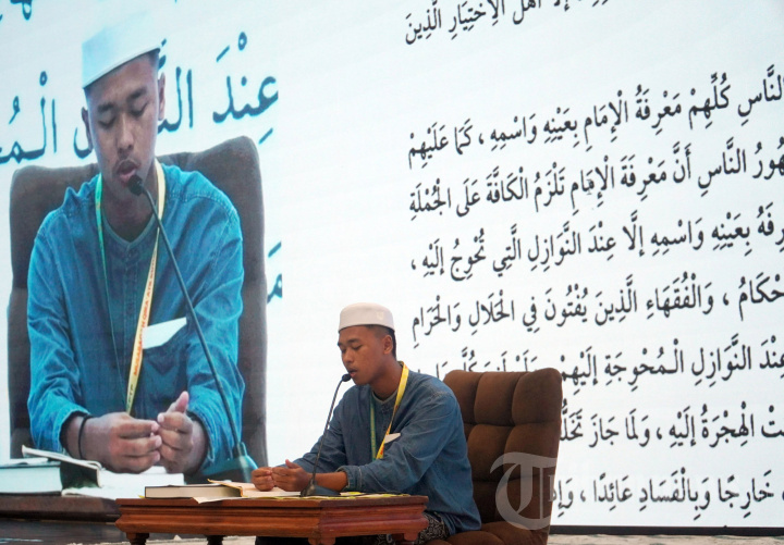PENUTUPAN MUSABAQAH - Peserta membaca kitab saat Musabaqah Qira???atil Kutub Nasional di Kantor DPP PKB, Senen, Jakarta Pusat, Minggu (9/11/2025). Perlombaan membaca kitab yang diikuti puluhan santri dari berbagai pesantren di Indonesia tersebut mengkaji tema khusus seputar fikih siyasah atau politik Islam sebagai upaya memperkuat pemahaman politik kebangsaan di kalangan santri. Warta Kota/Yulianto