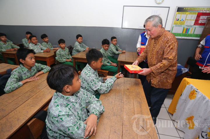 PENYERAHAN BANTUAN - Pendiri Agung Podomoro Group Trihatma Kusuma Haliman membagikan makan siang kepada siswa dalam kegiatan penyerahan bantuan di Yayasan Pendidikan dan Sosial Hikmatus Sholawat di kawasan Vimala Hills Villa & Resort, Ciawi, Bogor, pada Rabu (12/2/2025). PT Agung Podomoro Land Tbk. dan Agung Podomoro Group (APG) melalui Yayasan Agung Podomoro Land secara konsisten mendukung kemajuan pendidikan generasi muda di Indonesia melalui penyerahan bantuan kepada para siswa di Yayasan Pendidikan dan Sosial Hikmatus Sholawat Bogor. HO/Dok APG