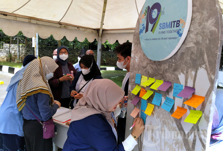 Karyawan Sekolah Bisnis Manajemen (SBM) ITB menulis pesan dan kesan dalam perayaan Hari Ulang Tahun (HUT) ke-19 SBM ITB, di halaman SBM ITB, Jalan Ganesha, Kota Bandung, Jawa Barat, Jumat (6/1/2023). Acara yang mengusung tema Flying Together: Value Co-Creation for ITB and Indonesia tersebut diisi dengan kegiatan talkshow "Education Ecosystem for Sustainable World", pameran bisnis, festival kuliner, dan hiburan. TRIBUN JABAR/GANI KURNIAWAN