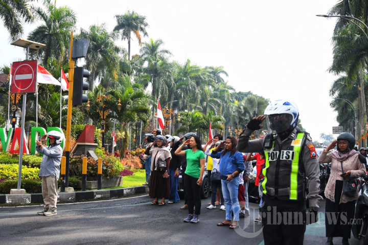 Anggota polisi dari Polresta Malang Kota, TNI, pelajar, warga, serta pengguna jalan memberikan hormat kepada bendera Merah Putih dan menyanyikan lagu Indonesia Raya saat peringatan detik-detik proklamasi di simpang empat Jalan Raya Ijen, Kota Malang, Jawa Timur, Sabtu (17/8/2024). Polresta Malang Kota menghentikan sementara lalu lintas dan aktivitas di sejumlah titik untuk mengajak para pengguna jalan memperingati detik-detik proklamasi kemerdekaan RI. SURYA/PURWANTO