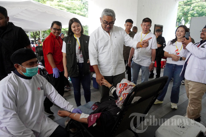 DONOR DARAH - Wali Kota Bandung, Muhammad Farhan didampingi Ketua IKA Unpar, Fabiola Tracy Permata Tardia dan Ketua Pelaksana Donor Darah Serentak, Laurensia Mety Handy menyapa warga yang sedang mendonorkan darahnya pada acara Donor Darah Serentak yang diselenggarakan Ikatan Alumni Universitas Katolik Parahyangan (IKA Unpar), di Balai Kota Bandung, Jawa Barat, Sabtu (15/11/2025). Kegiatan donor darah dalam rangka memperingati Hari Pahlawan itu digelar serentak di tiga kota, yakni Bandung, Jakarta, dan Surabaya, bekerja sama dengan Paguyuban Alumni Katolik Jakarta (PAKJ). Untuk Bandung, diikuti 333 peserta. Melalui aksi sosial ini, IKA Unpar berharap dapat membantu pemenuhan kebutuhan darah nasional serta meningkatkan kesadaran publik mengenai pentingnya donor darah sebagai gerakan kemanusiaan yang berkelanjutan. (TRIBUN JABAR/GANI KURNIAWAN)
