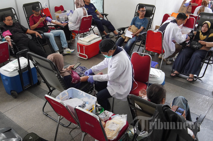 DONOR DARAH - Petugas medis PMI Kota Bandung melayani sejumlah warga yang mendonorkan darahnya pada acara Donor Darah Serentak yang diselenggarakan Ikatan Alumni Universitas Katolik Parahyangan (IKA Unpar), di Balai Kota Bandung, Jawa Barat, Sabtu (15/11/2025). Kegiatan donor darah dalam rangka memperingati Hari Pahlawan itu digelar serentak di tiga kota, yakni Bandung, Jakarta, dan Surabaya, bekerja sama dengan Paguyuban Alumni Katolik Jakarta (PAKJ). Untuk Bandung, diikuti 333 peserta. Melalui aksi sosial ini, IKA Unpar berharap dapat membantu pemenuhan kebutuhan darah nasional serta meningkatkan kesadaran publik mengenai pentingnya donor darah sebagai gerakan kemanusiaan yang berkelanjutan. (TRIBUN JABAR/GANI KURNIAWAN)