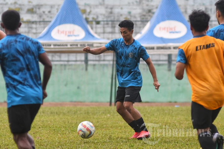 Pesepakbola seleksi Arema FC, Mochamad Shulton Fajar (tengah) mengontrol bola saat latihan rutin di Stadion Gajayana, Kota Malang, Jawa Timur, Selasa (2/7/2024). Arema FC melakukan persiapan jelang kompetisi Liga 1 musim 2024-2025. Dalam sesi latihan tersebut sejumlah pemain asing baru dan pemain seleksi ikut bergabung latihan. SURYA/PURWANTO