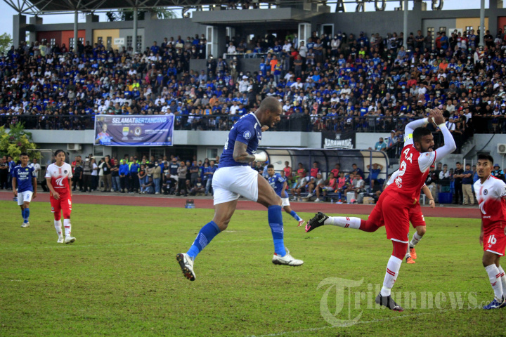 Pesepak bola Persib Bandung, David da Silva (tengah) mencoba menyundul bola dalam laga uji coba melawan Tanjung Pagar United di Stadion Citra Mas, Batam, Kepulauan Riau, Minggu (5/6). Persib Bandung berhasil unggul dengan skor 6-1 dalam laga uji coba persiapan menghadapi dimulainya Liga 1 2022/2023. Tribun Batam/Argianto DA Nugroho