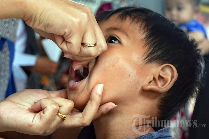 Seorang petugas kesehatan dari Puskesmas Nagaswidak sedang sedang memberikan imunisasi polio dosis ke 2 di Kawasan 11 Ulu, Palembang, Senin (12/8/2024). Kementerian Kesehatan (Kemenkes) kembali menyelenggarakan Pekan Imunisasi Nasional (PIN) Polio dalam dua tahap di 33 provinsi. Upaya ini dilakukan sebagai respons atas temuan kasus polio di beberapa daerah di Indonesia. Pelaksanaan Pekan Imunisasi Nasional (PIN) Polio putaran ke dua atau Dosis ke II dilakukan pada tanggal 6-12 Agustus 2024. (TRIBUN SUMSEL/ABRIANSYAH LIBERTO)