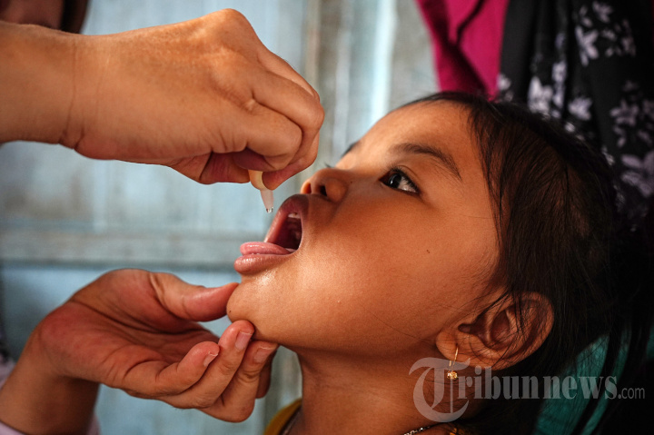 Seorang petugas kesehatan dari Puskesmas Nagaswidak sedang sedang memberikan imunisasi polio dosis ke 2 di Kawasan 11 Ulu, Palembang, Senin (12/8/2024). Kementerian Kesehatan (Kemenkes) kembali menyelenggarakan Pekan Imunisasi Nasional (PIN) Polio dalam dua tahap di 33 provinsi. Upaya ini dilakukan sebagai respons atas temuan kasus polio di beberapa daerah di Indonesia. Pelaksanaan Pekan Imunisasi Nasional (PIN) Polio putaran ke dua atau Dosis ke II dilakukan pada tanggal 6-12 Agustus 2024. (TRIBUN SUMSEL/ABRIANSYAH LIBERTO)