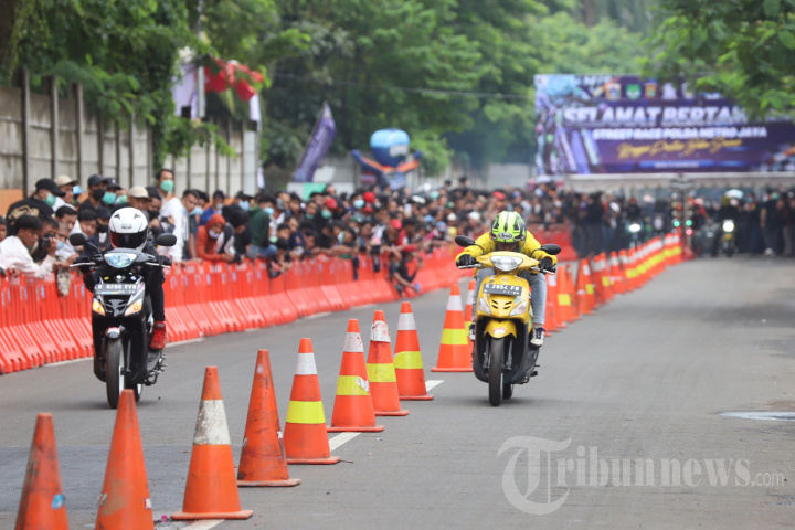 Peserta memacu sepeda motornya dalam ajang Street Race yang di gelar Polda Metro Jaya, Jakarta Selatan, Minggu (16/1/2022). Ajang lomba balap sepeda motor jalanan legal yang diprakarsai oleh Kapolda Metro Jaya Irjen Pol Fadil Imran tersebut untuk memfasilitasi para pembalap liar agar tidak melakukan balapan di jalan. Tribunnews/Jeprima
