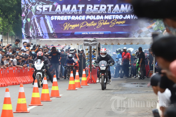 Peserta memacu sepeda motornya dalam ajang Street Race yang di gelar Polda Metro Jaya, Jakarta Selatan, Minggu (16/1/2022). Ajang lomba balap sepeda motor jalanan legal yang diprakarsai oleh Kapolda Metro Jaya Irjen Pol Fadil Imran tersebut untuk memfasilitasi para pembalap liar agar tidak melakukan balapan di jalan. Tribunnews/Jeprima