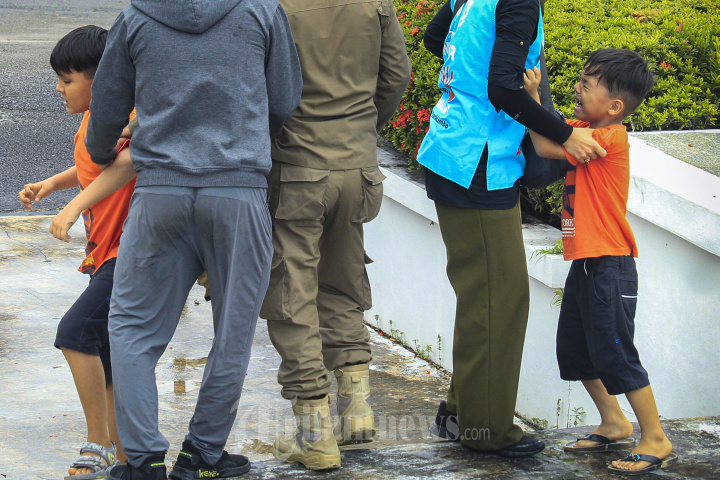 Anak seorang imigran asal Afganistan menangis saat terjadi bentrok di DPRD Kota Batam, Rabu (16/2/2022). Bentrok yang terjadi antara Polisi , Satpol PP dengan Pengungsi asal Afganistan ini berawal dari pembubaran paksa pihak kepolisian karena dianggap aksi tersebut tidak berizin. TRIBUN BATAM/ARGIANTO