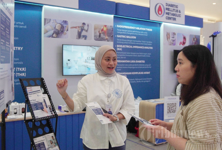 KESEHATAN - Petugas menerangkan kepada pengunjung saat acara Primaya Fair 2025 di Jakarta, Kamis (16/10/2025). Kolaborasi ini menandai penggunaan produk Kalbe Regenic Stem Cell di seluruh jaringan rumah sakit Primaya untuk penanganan mendukung medis lanjutan, khususnya pada bidang orthopedi. Tribunnews/Jeprima