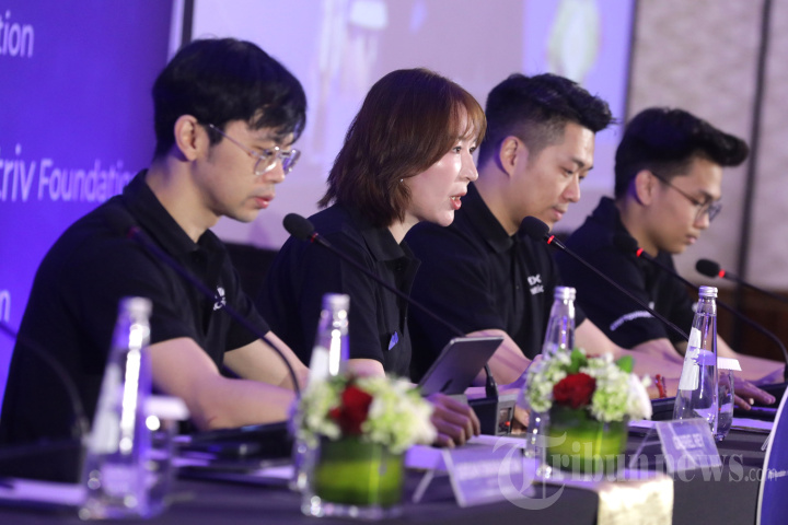 PROGRAM BEASISWA - CEO & Founder TRIV Gabriel Rey (kiri) bersama VP Of Mexc Foundation Kristina Xu (kedua kiri), ID Country Manager of Mexc Foundation Excel (kedua kanan) dan CEO Cryptowave Goldwin (kanan) memberi penjelasan disela-sela pengumuman kolaborasi Triv Foundation x MEXC Foundation di Jakarta, Rabu (12/11/2025). MEXC Foundation bekerja sama dengan Triv, platform pedagang aset kripto di Indonesia secara resmi mengumumkan peluncuran Program Beasiswa F.I.R.E (Future Innovators in Rising Economy), dimana program ini merupakan sebuah inisiatif yang dirancang untuk menumbuhkan generasi pemimpin blockchain dan Web3 Indonesia berikutnya melalui pendidikan, pendampingan (mentorship), dan paparan langsung terhadap industri nyata. TRIBUNNEWS/IRWAN RISMAWAN