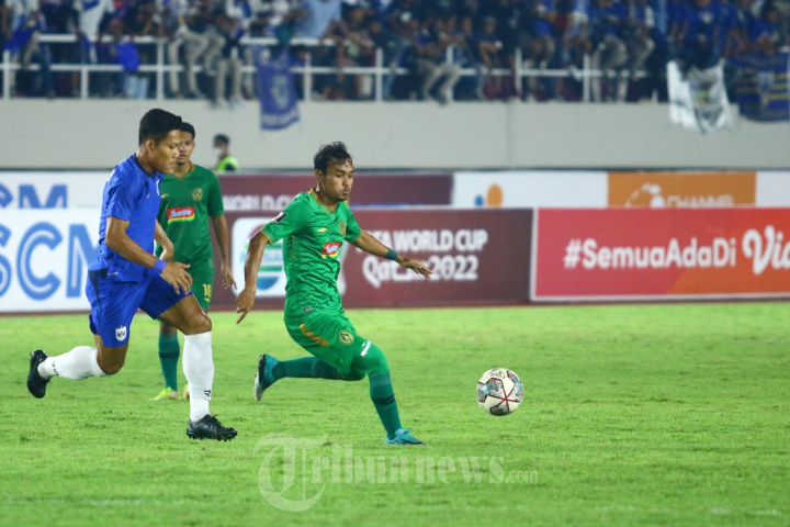 Aksi pemain PSS Sleman Komarodin saat menggiring bola mendapat kawalan ketat dari pemain PSIS Semarang Wahyu Prasetya dalam laga Grup A Piala Presiden 2022 di Stadion Manahan Solo, Jumat (24/6/2022) malam - (Tribun Jateng/Franciskus Ariel Setiaputra)
