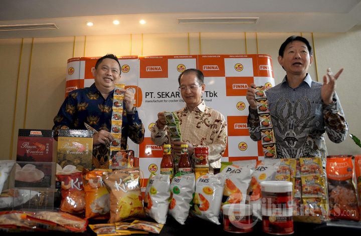 TERDAMPAK - Dari kiri, Secretary Jimmy Herlambang, Direktur John C Gozal dan Direktur Sandiono Sungkono pada 'Public expose Tahunan PT Sekar Laut Tbk di Surabaya, Selasa (28/4/2026). Penyampaian hasil RUPS tahunan ini diantaranya membahas adanya perubahan beraneka produksi akibat kenaikan bahan baku termasuk kemasan serta rencana meningkatkan produksi dengan peremajaan mesin baru. (SURYA/HABIBUR ROHMAN)
