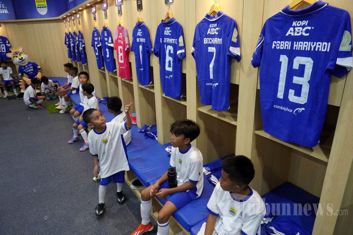 PELATIHAN SEPAK BOLA - Sejumlah anak-anak mengunjungi locker room baru Persib pada Persibday Festival 2025 di Stadion Gelora Bandung Lautan Api (GBLA), Kota Bandung, Jawa Barat, Minggu (12/10/2025). Pada acara ini, sebanyak 200 peserta, terdiri dari anak-anak usia 10?14 tahun mendapat kesempatan mengikuti coaching clinic dan berlatih bersama empat pemain Persib, Luciano Guaycochea, Uilliam Barros, Julio C?sar, dan Adam Alis, dengan pendampingan dari Asisten Pelatih Kiper Persib, I Made Wirawan dan Pelatih Fisik Persib, Yaya Sunarya. Selain itu, mereka juga mengikuti kegiatan lainnya, yakni meet & greet dengan pemain, hingga stadium tour dengan menyusuri lorong pemain, ruang konferensi pers, dan locker room baru Persib yang baru direnovasi. Festival tersebut menjadi bagian dari komitmen klub untuk terus memperkuat kedekatan dengan bobotoh dan masyarakat luas. (TRIBUN JABAR/GANI KURNIAWAN)