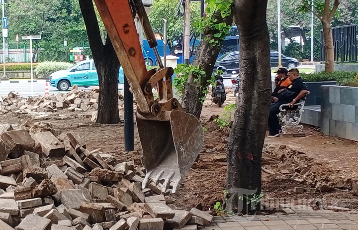 Pekerja dengan mengunakan alat mengupas trotoar di Jalan Medan Merdeka Selatan, Senin (18/10/2022). Trotoar akan dibuat lebih indah dan kuat untuk kenyamanan pejalan kaki. (Warta Kota/Henry Lopulalan)